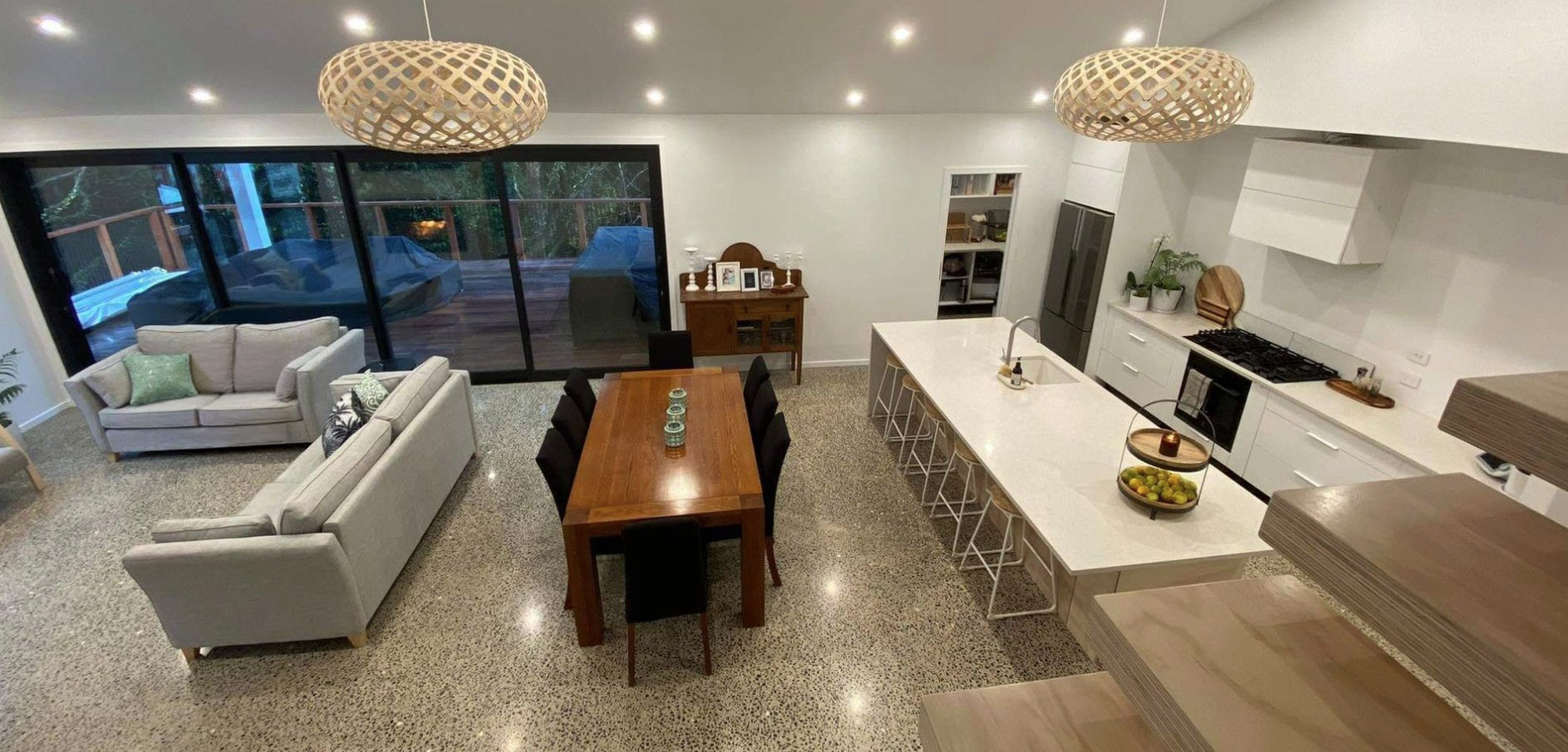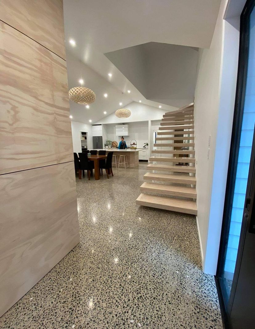 Farrell Concrete provided the full concrete grinding and polishing service for this new build, achieving a refined polished finish that ties the interior design elements together. The reflective surface helps amplify natural light, creating a bright and open atmosphere throughout the living areas. The exposed aggregate finish adds texture and visual interest, working seamlessly alongside the natural materials and modern architectural lines used throughout the home.