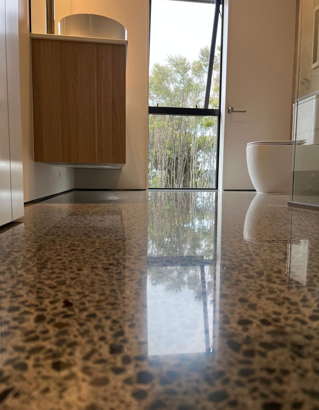 Set in the peaceful hills of Mt Tiger, this modern home blends clean architectural lines with expansive views and natural surroundings. With large areas of glazing and warm interior materials, the space called for a flooring solution that would enhance light, complement the design and deliver long term durability. Farrell Concrete were engaged to carry out the full concrete grinding and polishing service, completing 180 square metres of premium Husqvarna Platinum finish throughout the home.