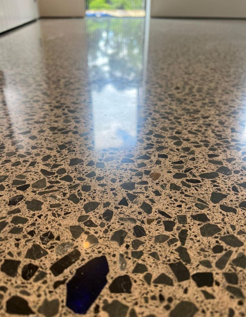 Farrell Concrete completed 180 square metres of Husqvarna Platinum polished concrete flooring for this Mt Tiger home, showcasing exposed aggregates and a bespoke high clarity finish.